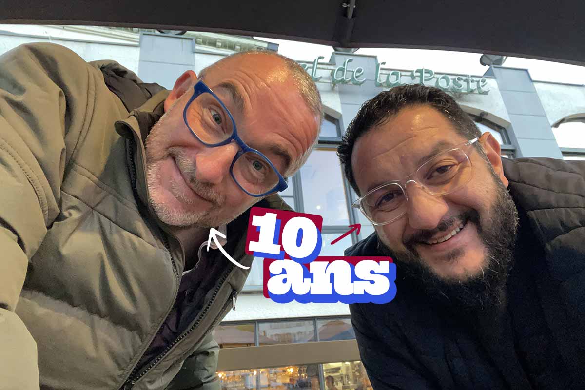 En 10 ans sont apparus des cheveux blancs et des lunettes à verres progressifs. Mais une chose n’a pas bougé, c’est l’envie de créer et faire rire. Sans vous, notre santé mentale serait au troisième sous-sol. Grâce à vous, pendant ces 10 ans, nous avons transformé le drame en comédie, pris du recul, envisagé un monde meilleur et surtout, beaucoup, mais alors, beaucoup ri. Et ça va continuer, parce qu’on est vraiment bien ensemble.