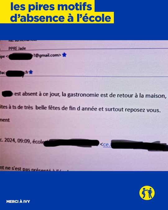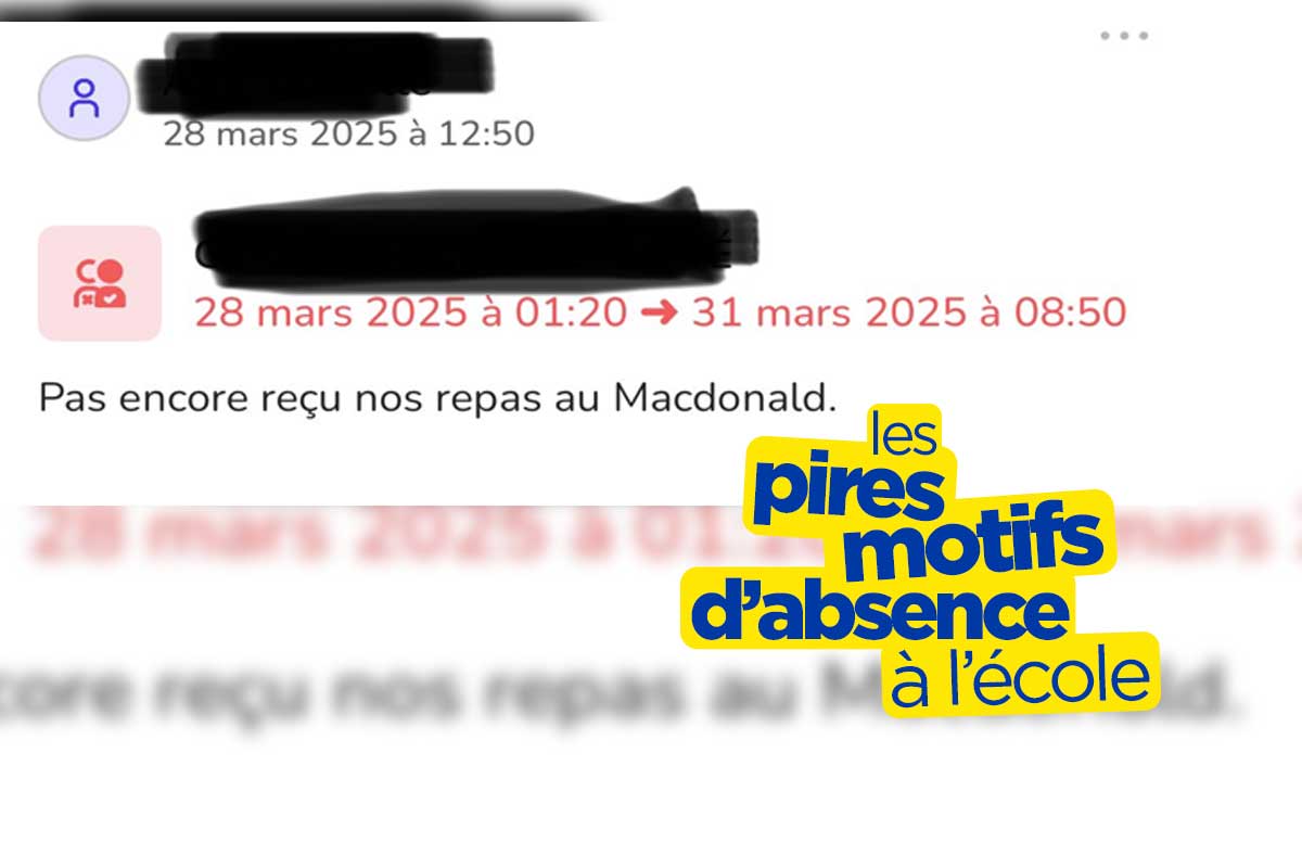 Entre un Happy Meal et une évaluation de grammaire, le choix est vite fait. Pourquoi s’embêter à apprendre l’accord de l’adjectif quand on peut s’avaler une boîte de 4 Chicken McNuggets ? Voici 10 nouveaux motifs d’absence improbables à l’école.