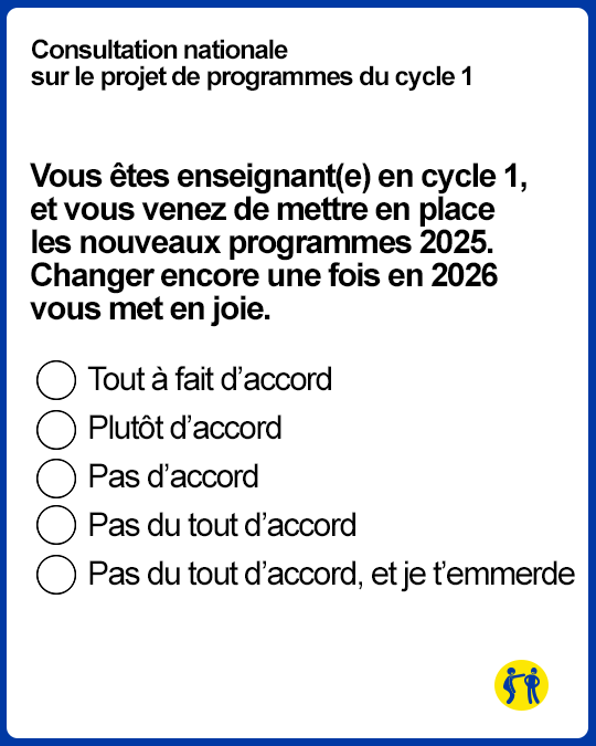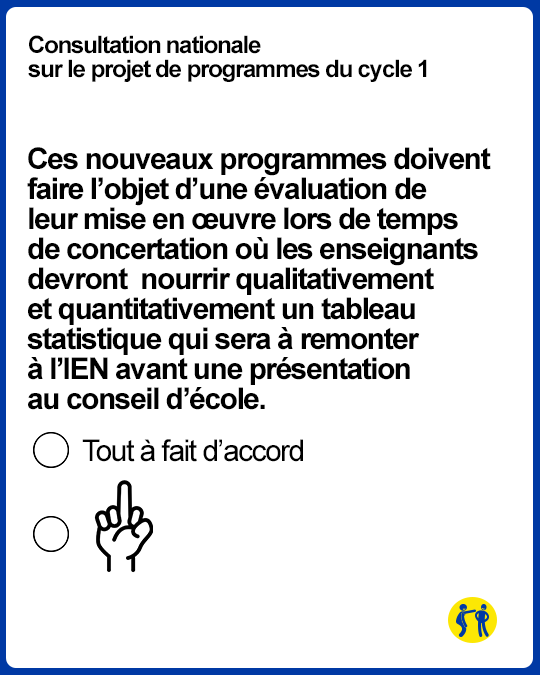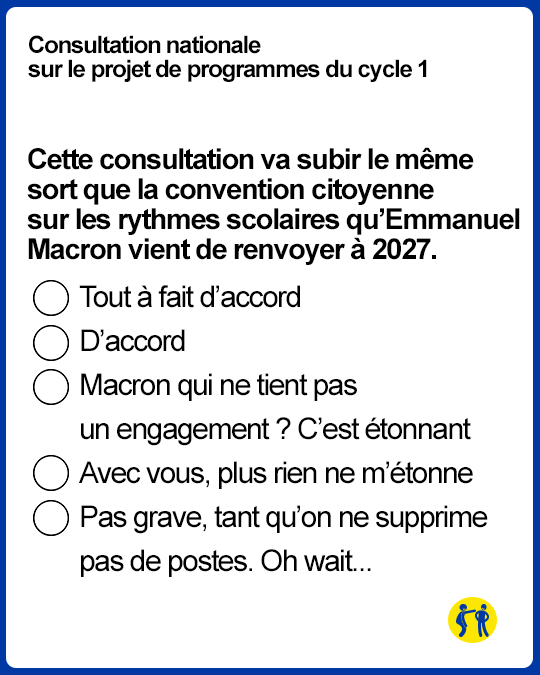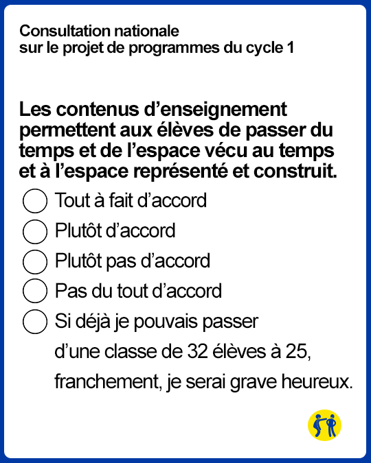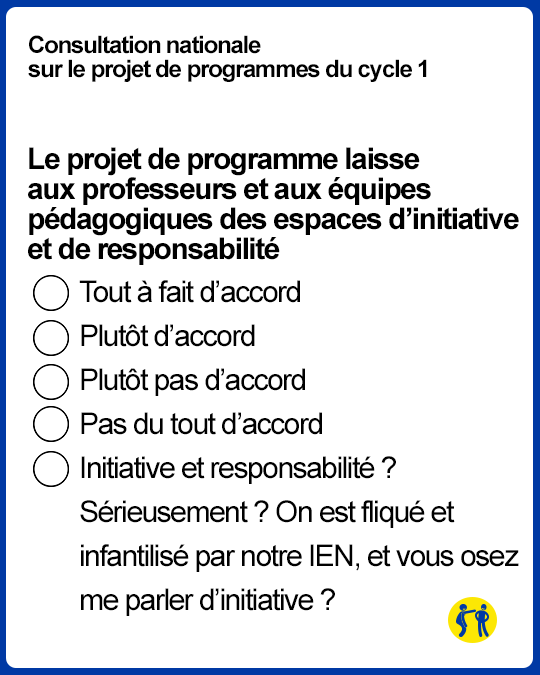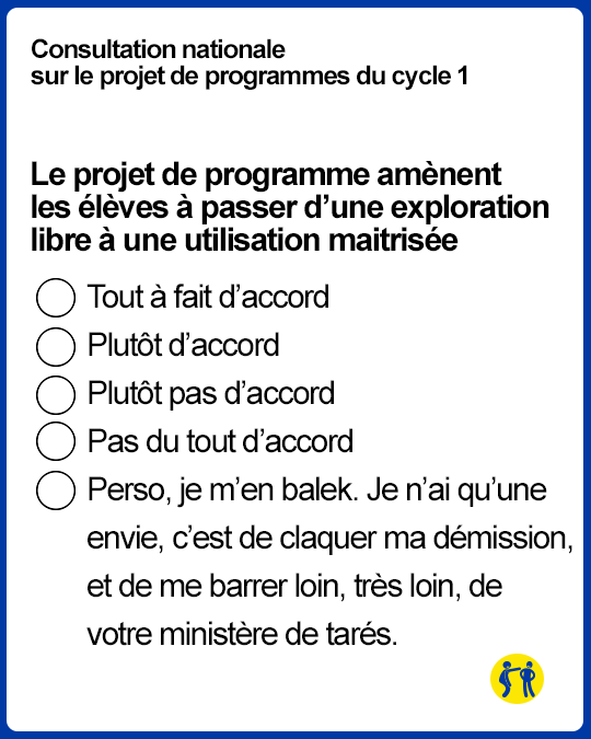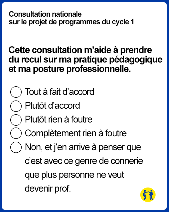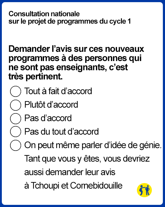 Effectivement, si en maternelle, les élèves ont douze ans, il serait judicieux de changer les programmes. Si vous voulez participer à cette enquête, rendez-vous sur le site Educscol, et si vous n’avez pas envie de perdre votre temps (les consultations de l’Education nationale, tout le monde sait où ça se termine), voici quelques (fausses) questions extraites de cette consultation.