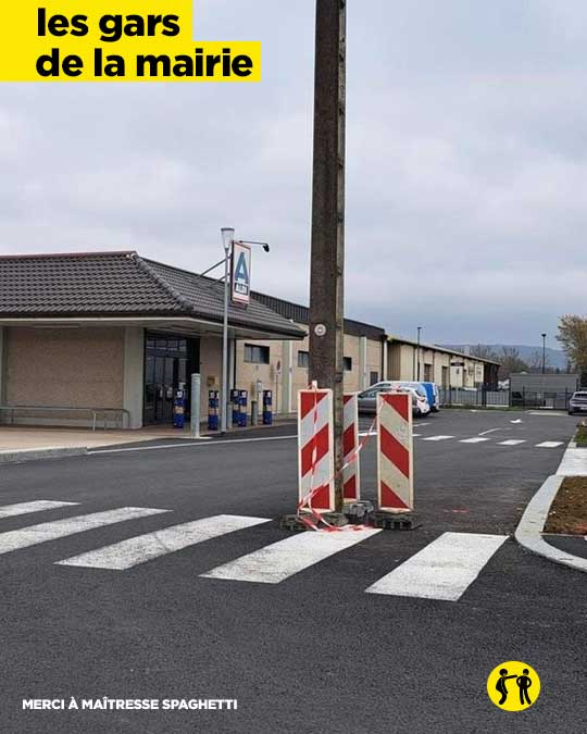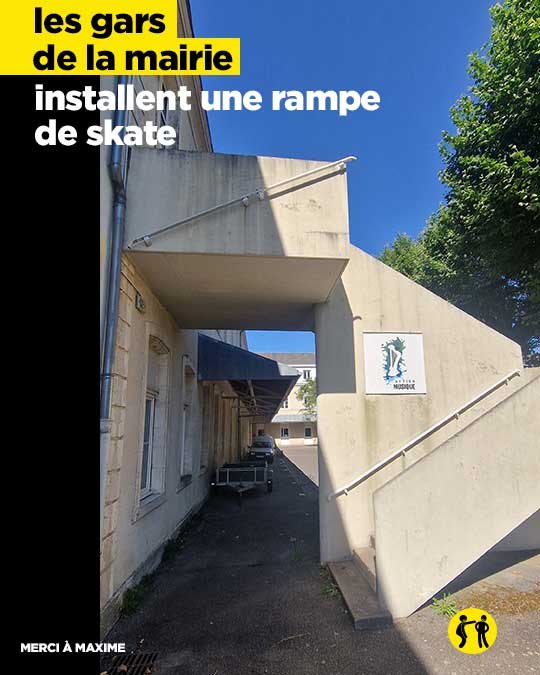 Et c’est parti pour un épisode spécial des gars de la mairie. Aujourd’hui, nos héros préférés quittent l’école et s’en vont exercer leur art en bas de chez vous. Installation d’un panneau, d’une rampe de skate ou d’une chicane, les gars de la mairie frétillent une nouvelle fois de la boîte à outils.